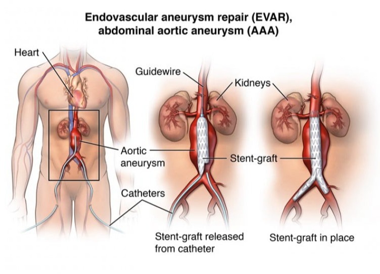 Ενδαγγειακή αντιμετώπιση με κεφαλή κορυφαίας αορτής (EVAR - Endovascular Aneurysm Repair): Αυτή η τεχνική εμπλέκει την τοποθέτηση ενός στεντ μέσω μιας μικρής τομής στο προσθιοκοιλιακό τοίχωμα για την επισκευή του ανευρύσματος.